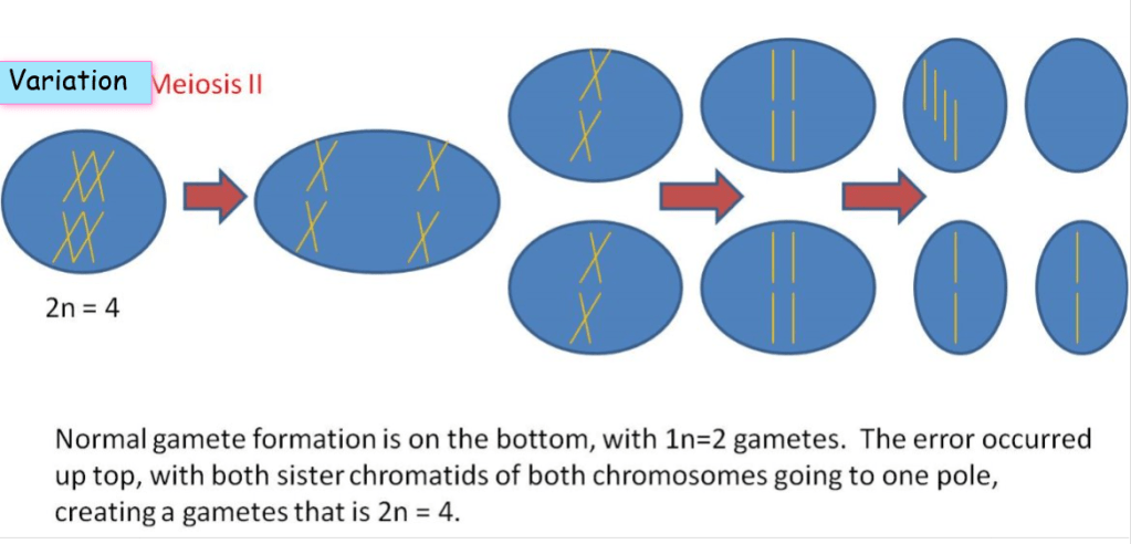 If the variation occurs during the second meiosis, the result will be one gamete with double chromatids, two gametes with the expected number of chromatids, and one that has no chromatids.