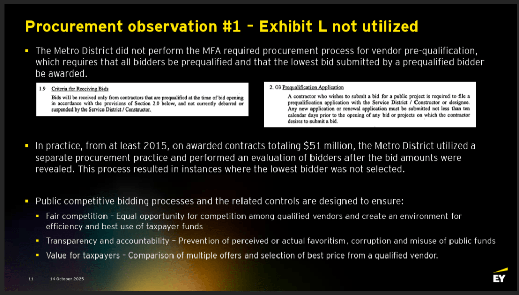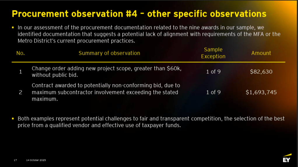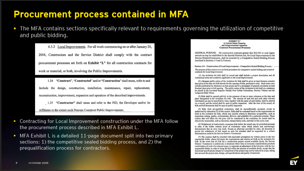 - Ernst & Young examined 73 cash disbursements and 9 public bid awards from Centerra’s main metropolitan district, which was created in 2004 to fund infrastructure and economic development projects.
