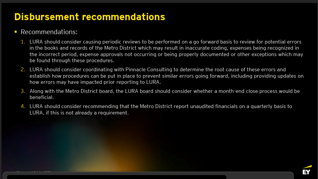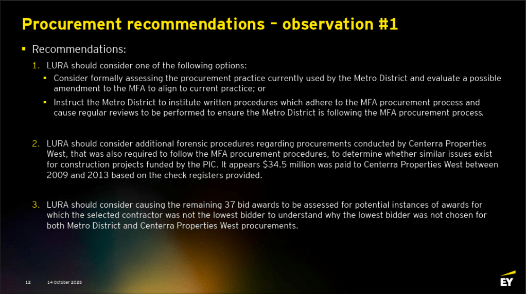 Ernst & Young’s forensic audit of Centerra uncovered serious financial irregularities, including misclassified expenses, related-party transactions, and violations of competitive bidding rules. The audit scrutinized over $1 billion in cashflows tied to Loveland’s urban renewal efforts.