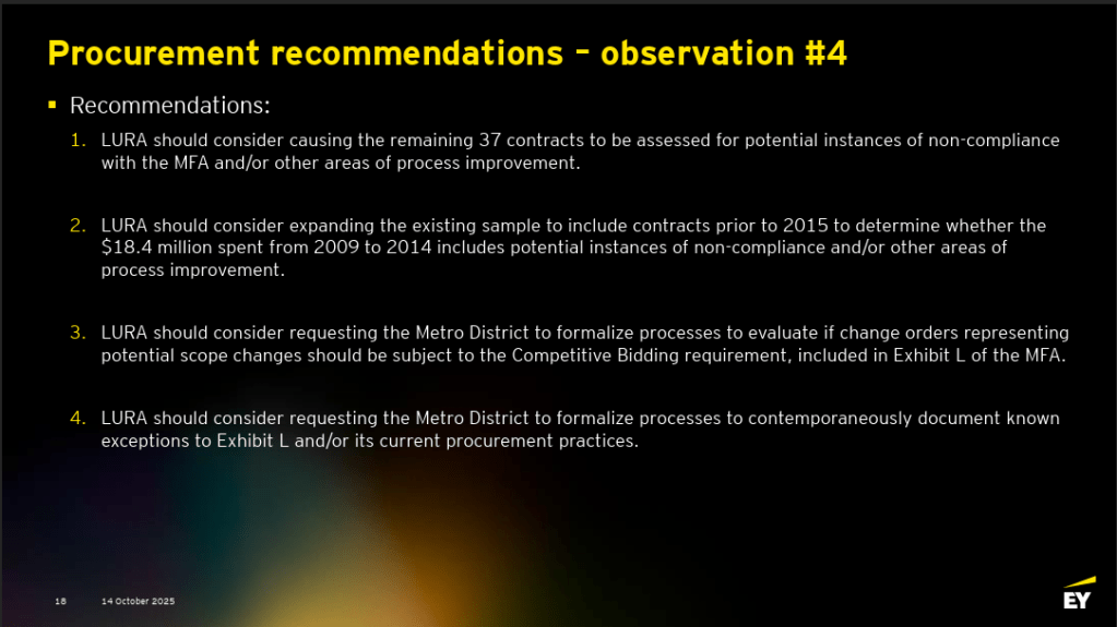 - Legal implications: Violations of the master financing agreement and procurement rules could expose the city and LURA to litigation or require renegotiation of terms.