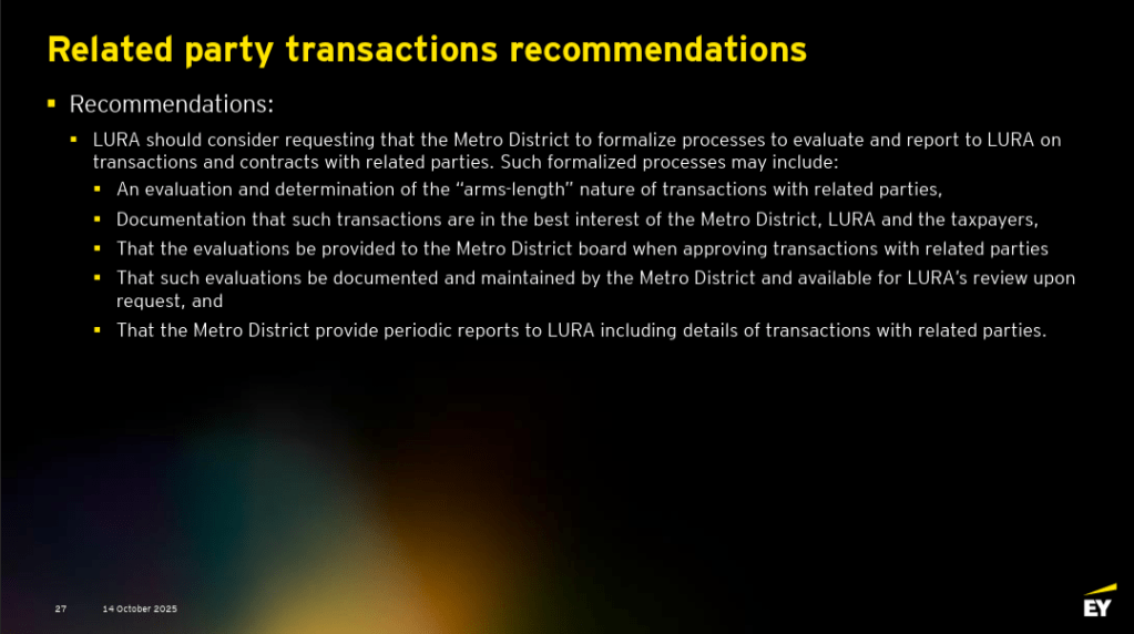 - The Ernst & Young audit flagged “related-party transactions” between Centerra’s metropolitan districts and entities affiliated with McWhinney Real Estate Services.
