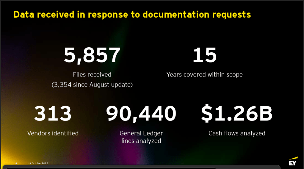 - Lack of oversight: Ernst & Young flagged that these transactions occurred “without much oversight,” suggesting weak internal controls and potential misuse of public funds.