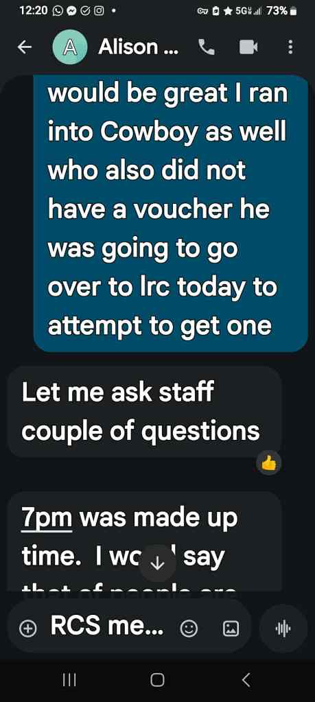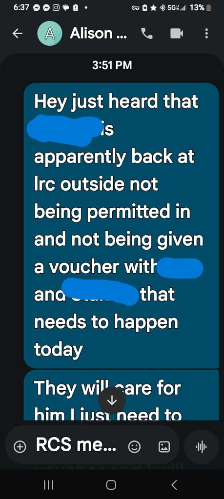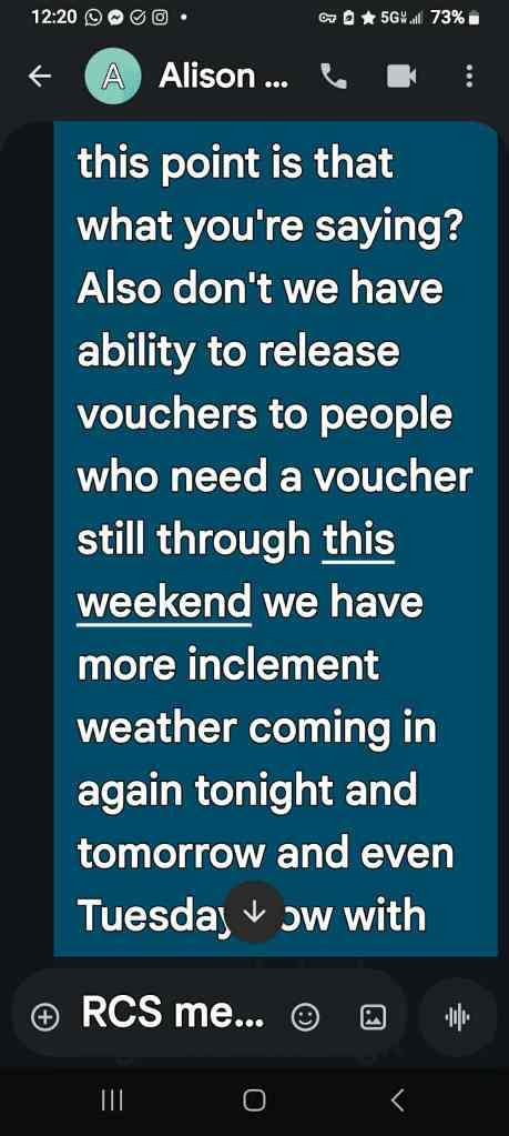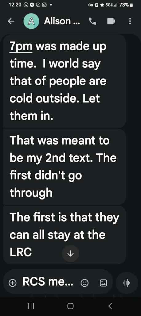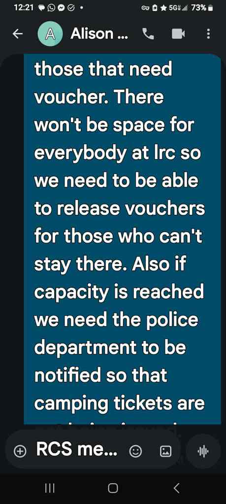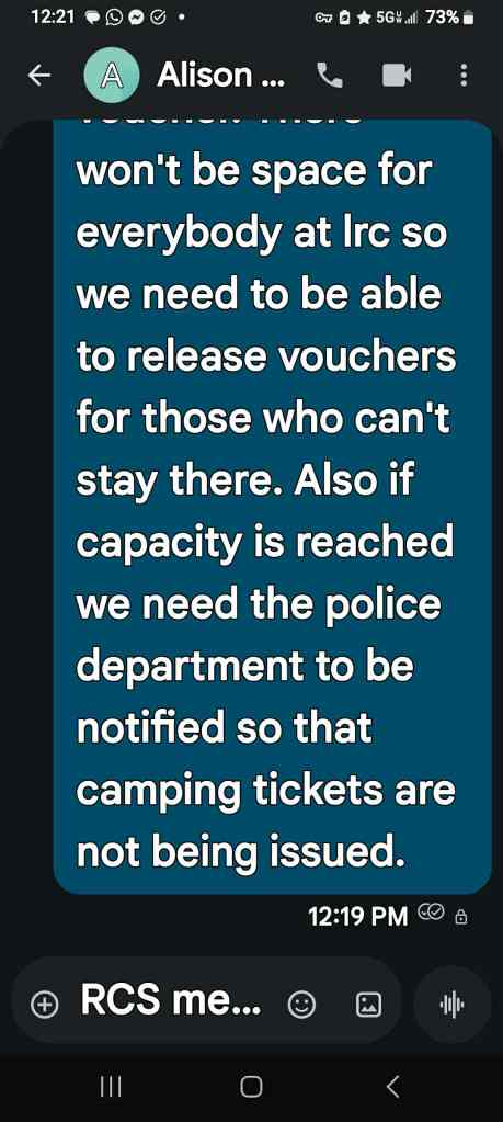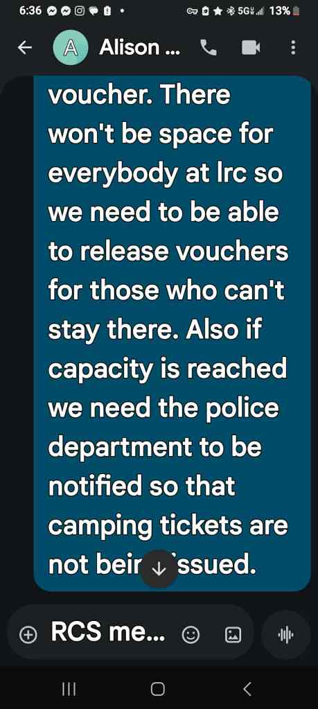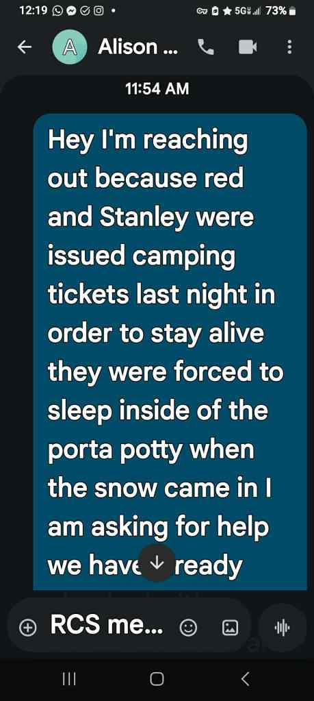 Jen is still waiting to hear back about the Red Cross Shelter. Theere Nobody from the city ever provided a location or contact person, just a promise and deflection while another cold night passes.